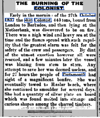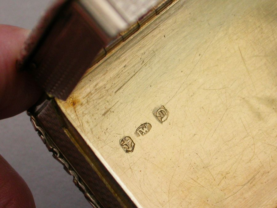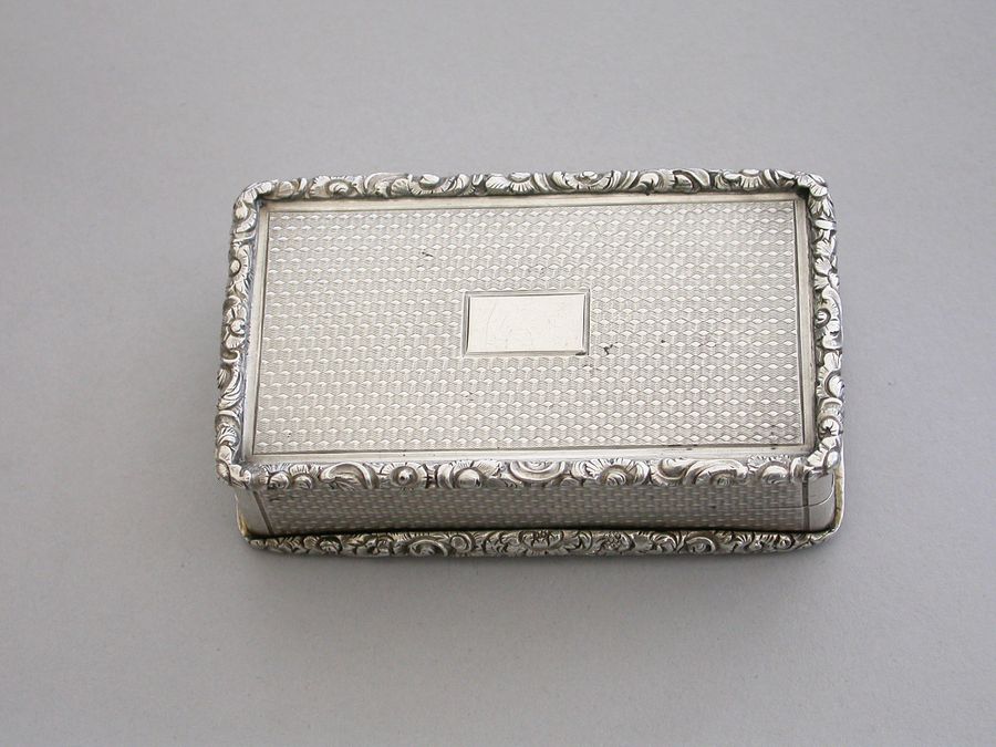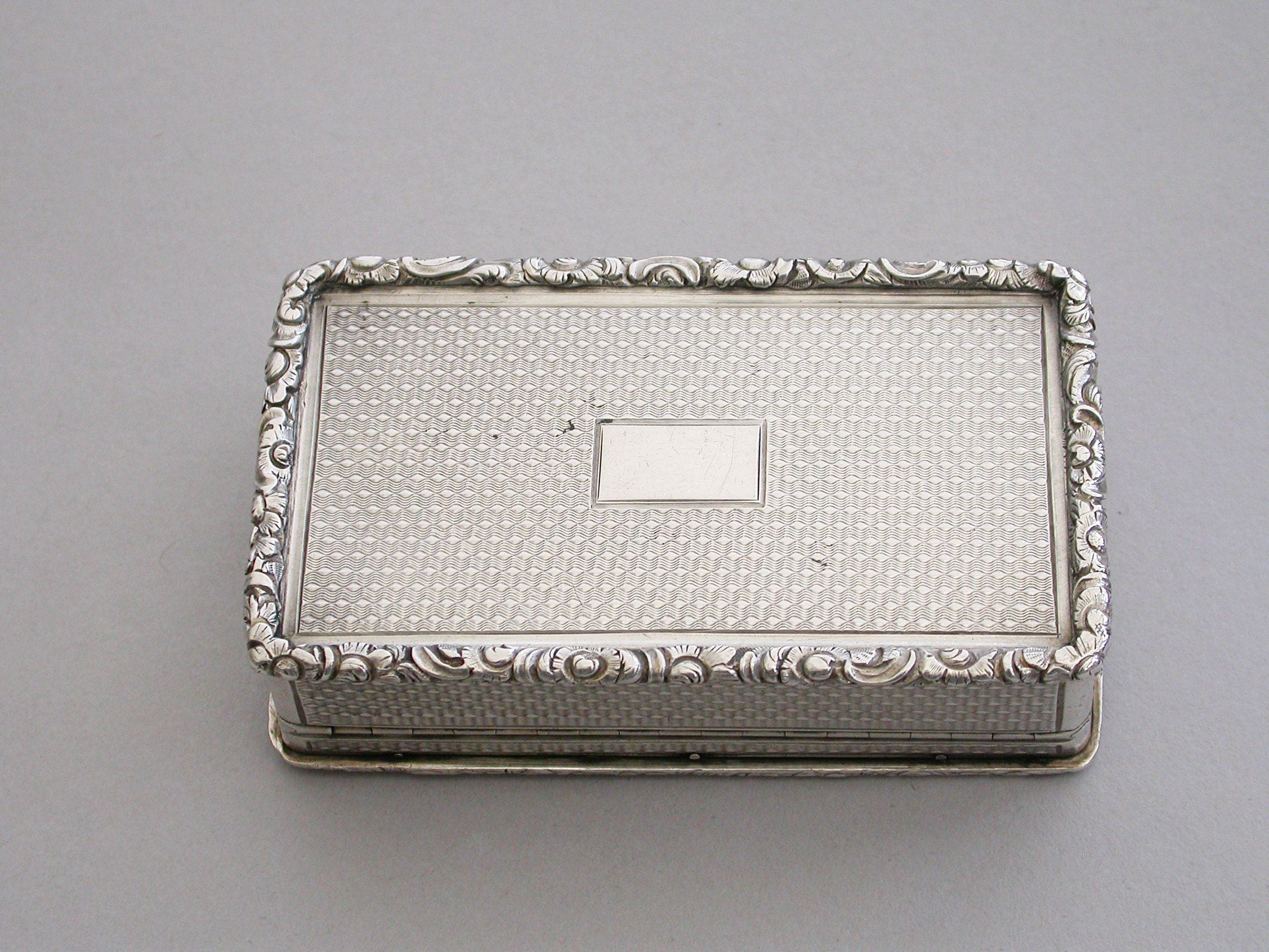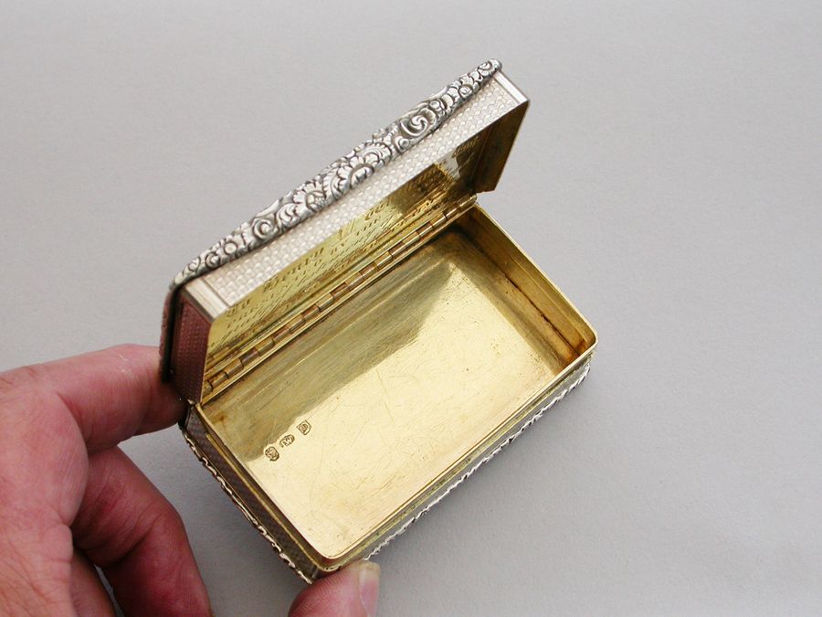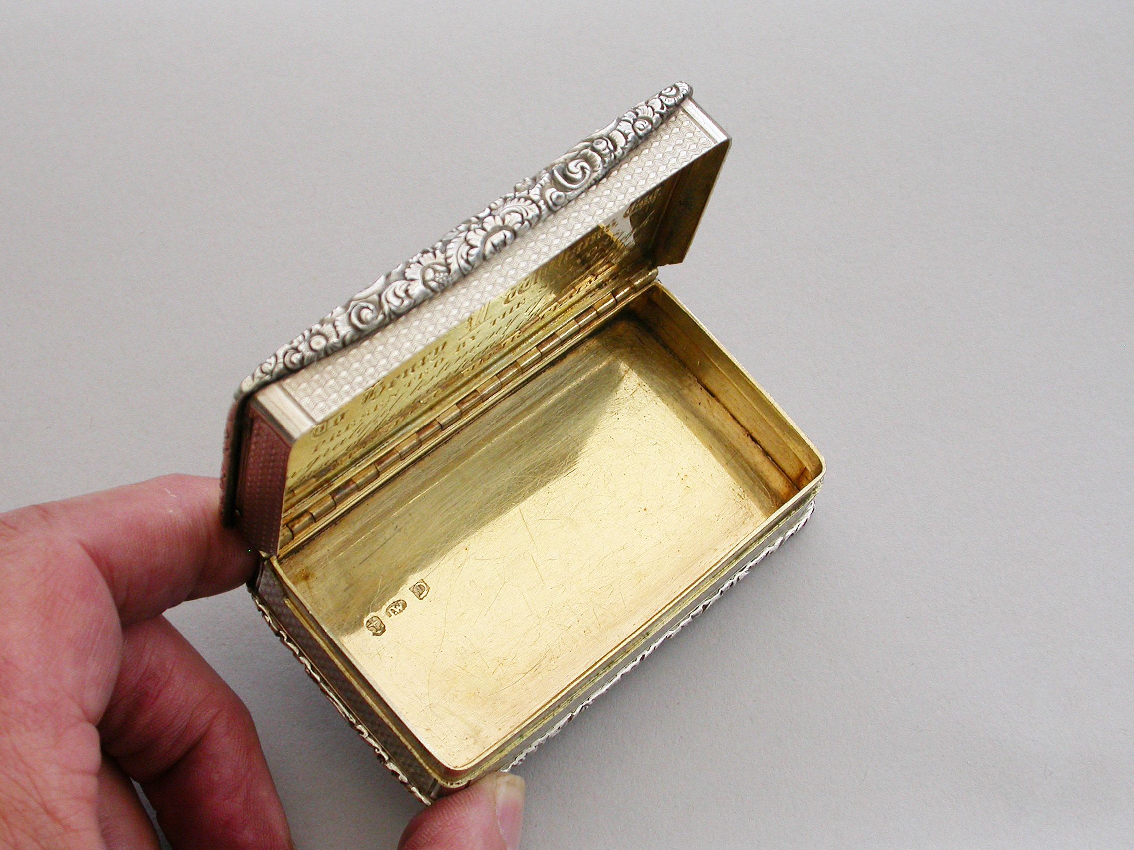 A rare and unusual William IV silver Snuff Box of rectangular form with engine turned decoration to the base and sides, raised foliate scroll chased borders and a raised scene to the lid depicting the ship COLONIST, burning at the Mother Bank at 10pm 27 Oct 1837. The hinged lid opening to a gilded interior with presentation inscription dedicated to Henry Justice Williams Esq ;-