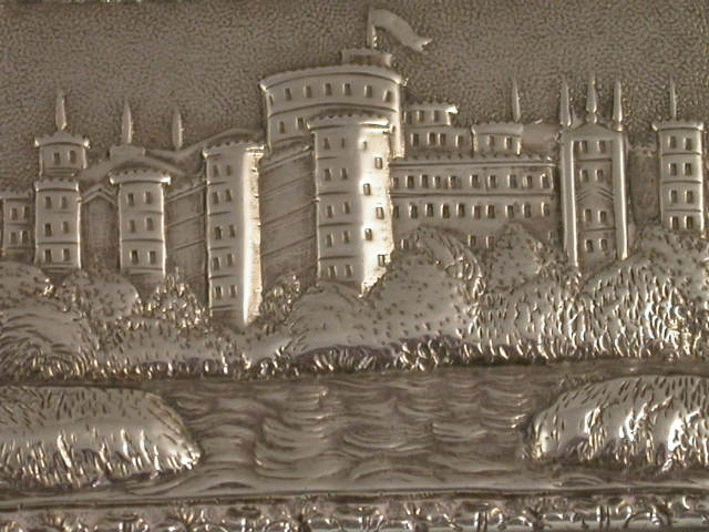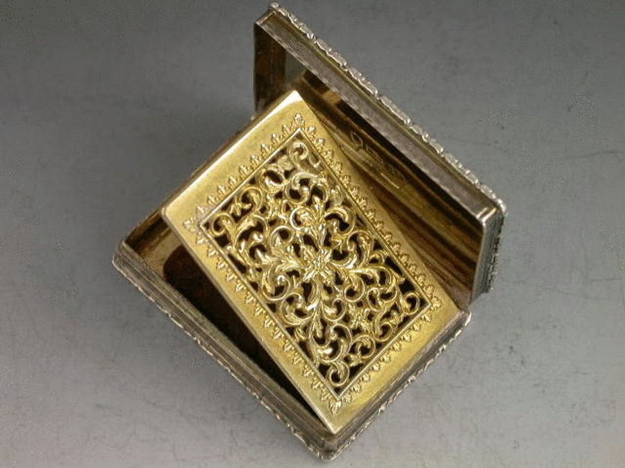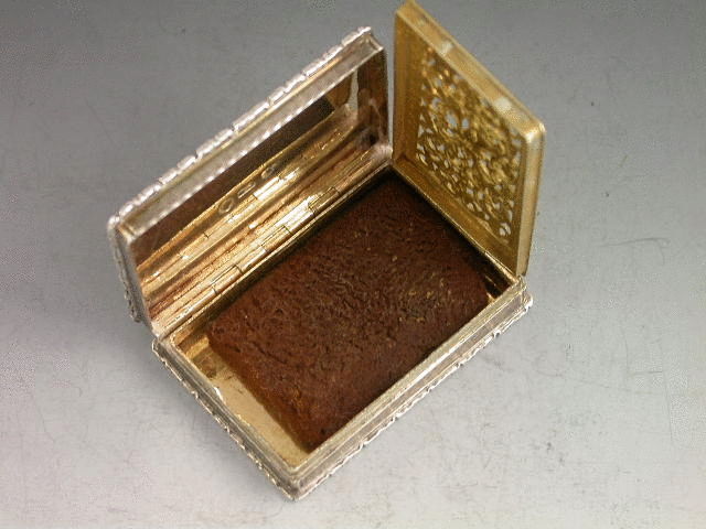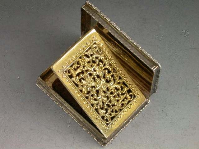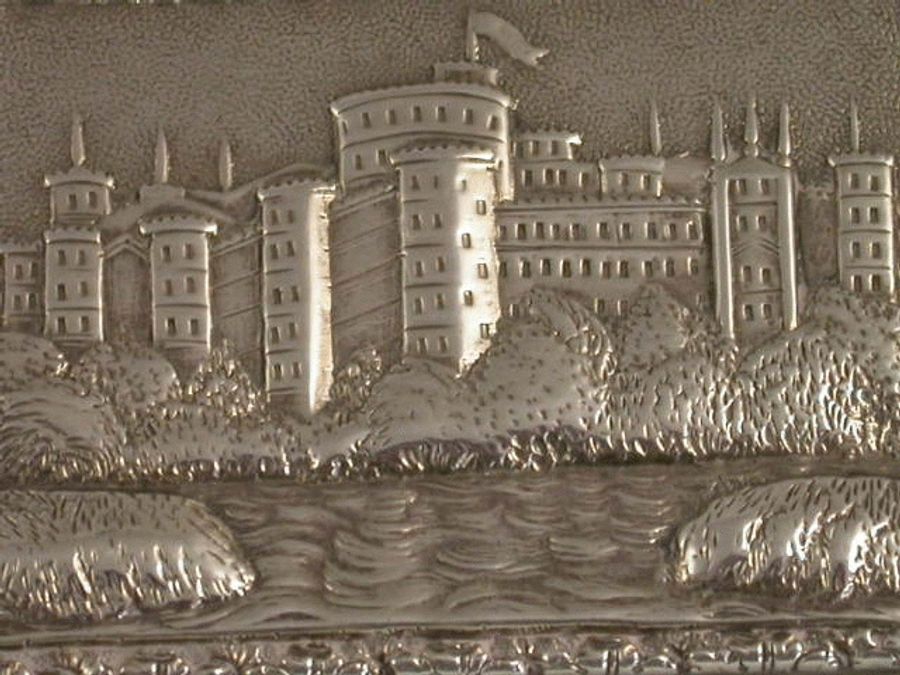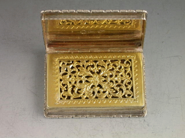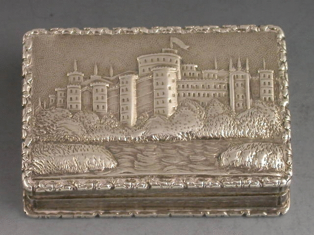 A rare William IV silver Vinaigrette of rectangular form with engine turned base and sides, the lid chased and engraved with a raised scene depicting the rare south west view of Windsor Castle. Silver gilt interior intricately pierced grille. Complete with original sponge.
