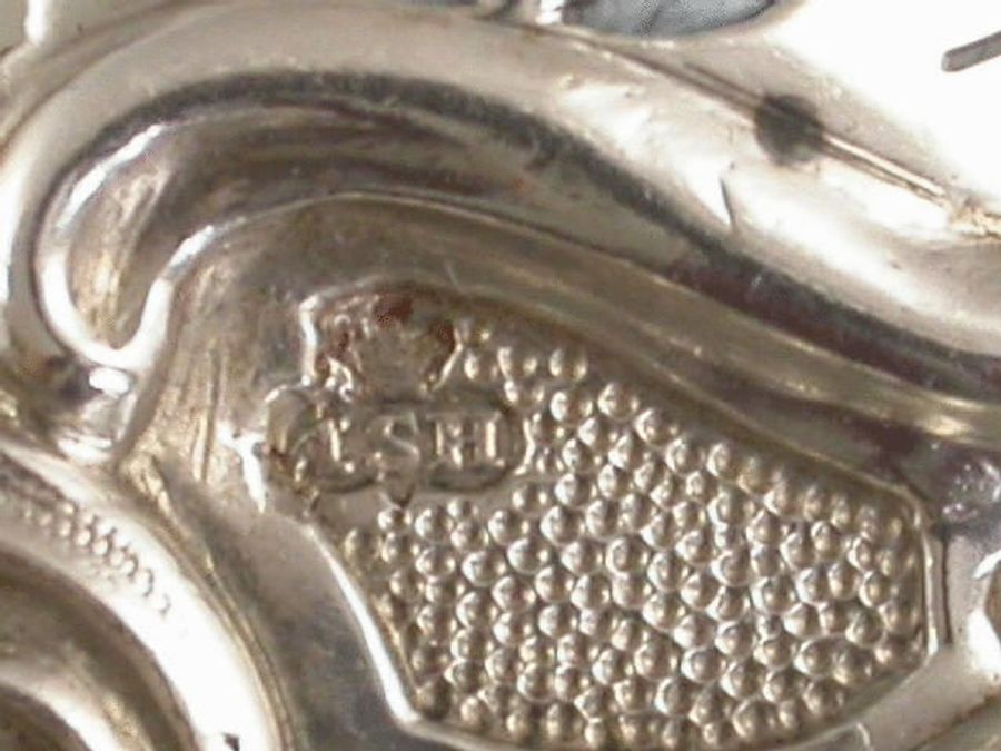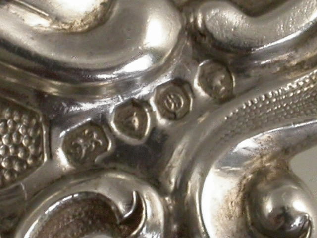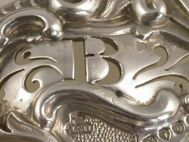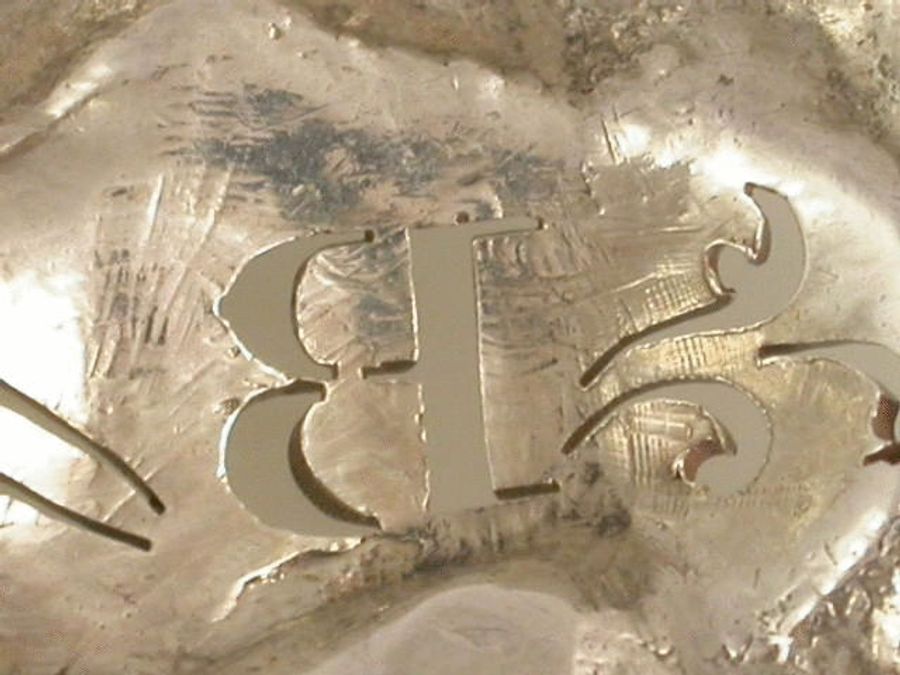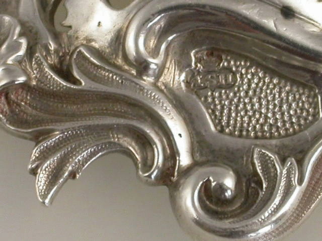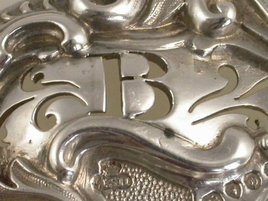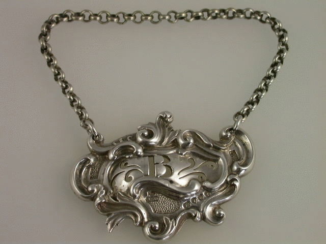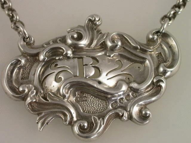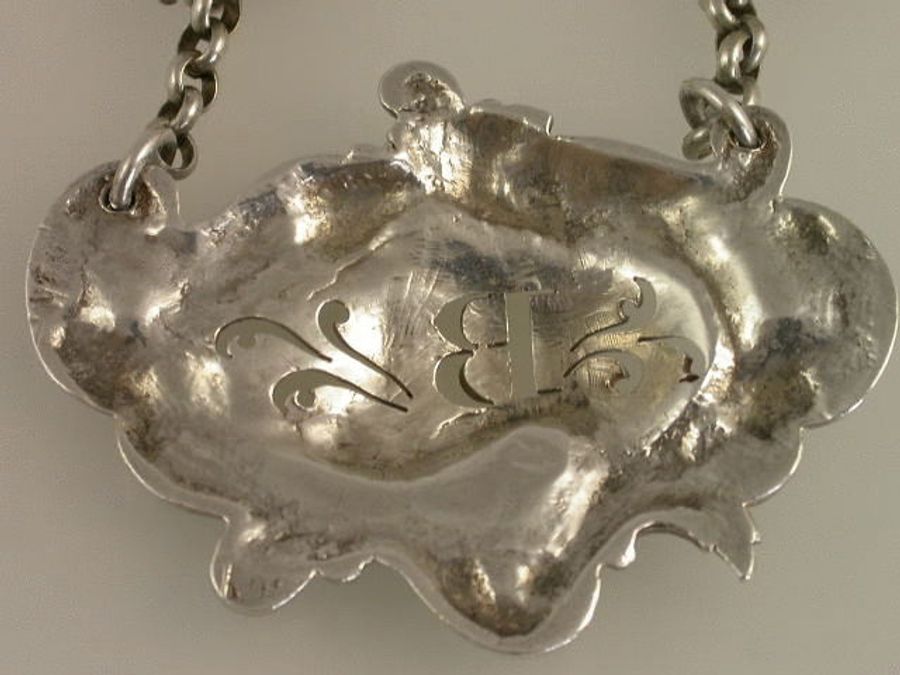A very fine quality early Victorian heavy cast silver Wine Label of elaborate Rococo scroll form with acanthus leaves and stippled matt background, pierced with the initial letter “B” between pierced scrolls.