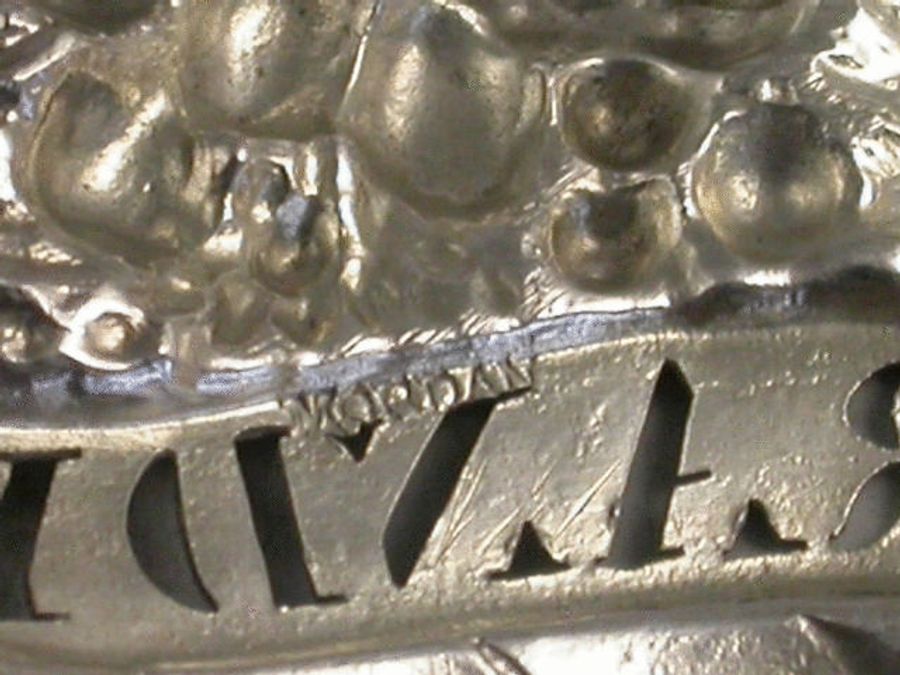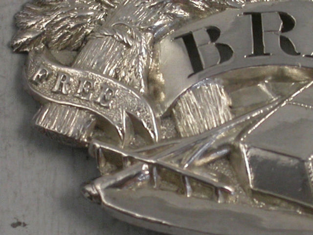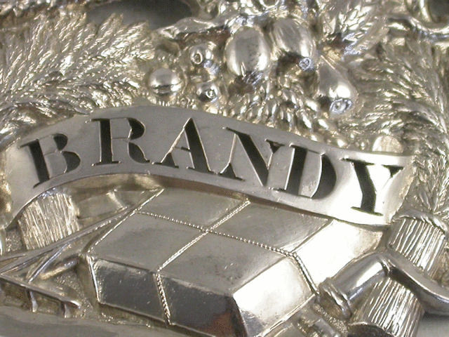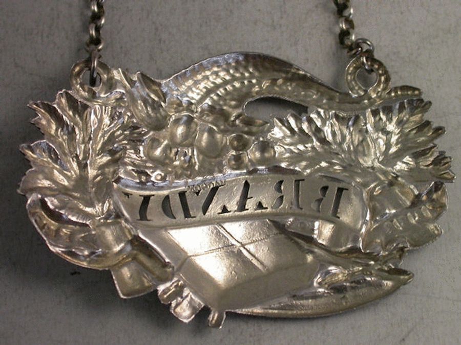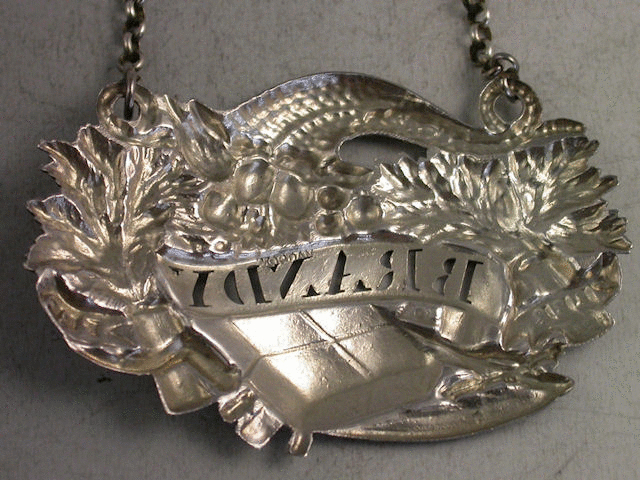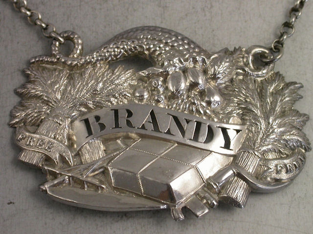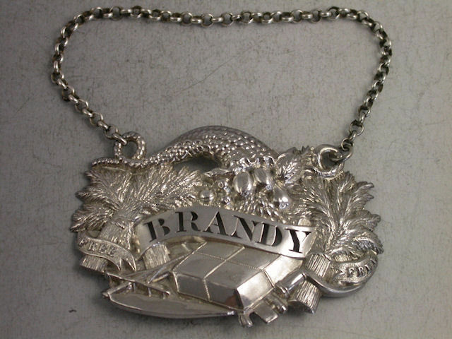 An extremely rare early Victorian die-stamped silver Wine Label, pierced for Brandy on a scrolled name plate surrounded by a cornucopia over flowing with fruit, wheat sheaves, a rake, a scythe, a sickle and some tied bails, with a banner either side stamped with the word ‘FREE’. This label maybe linked to the repeal of the Corn Laws in 1832, or perhaps to the early moves towards Free Trade in the early Victorian era.