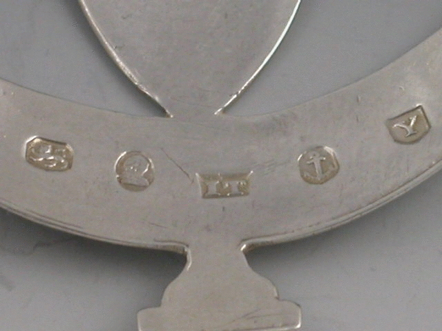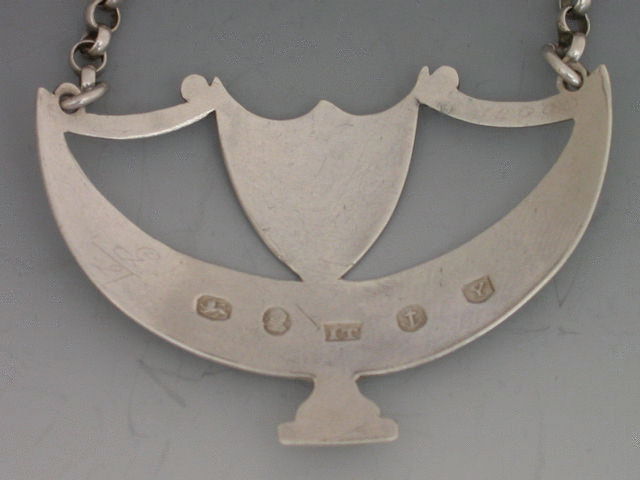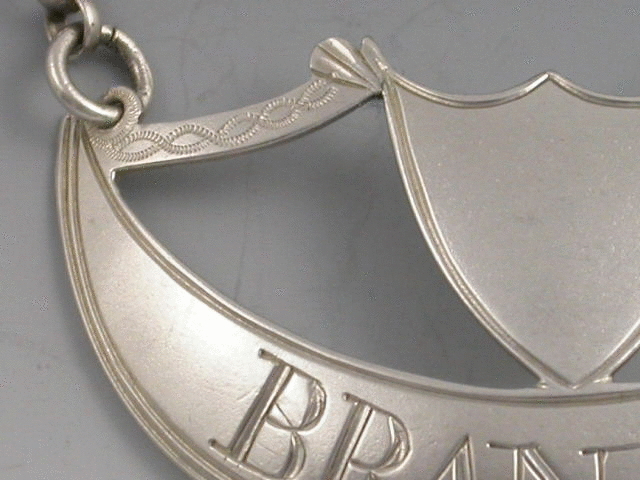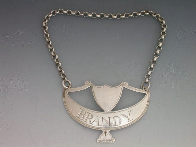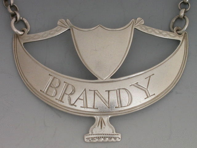 A good George III 18th century silver Wine Label of goblet form with shield surmount supported by a stays, bright cut engraved decoration, incised for BRANDY.
