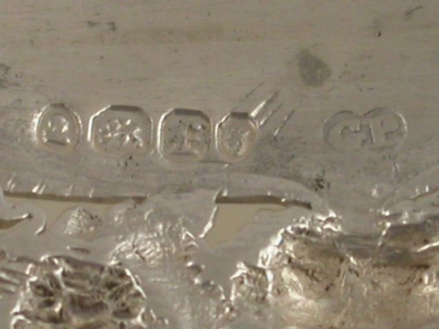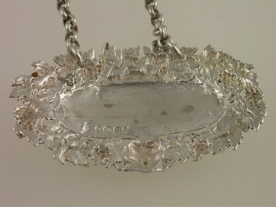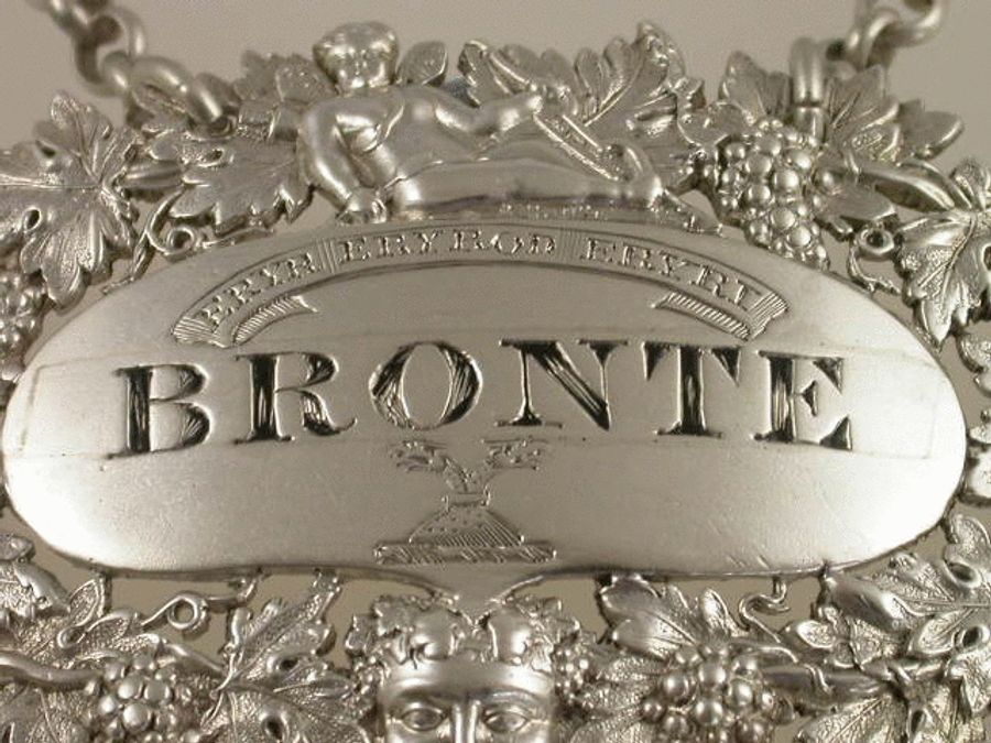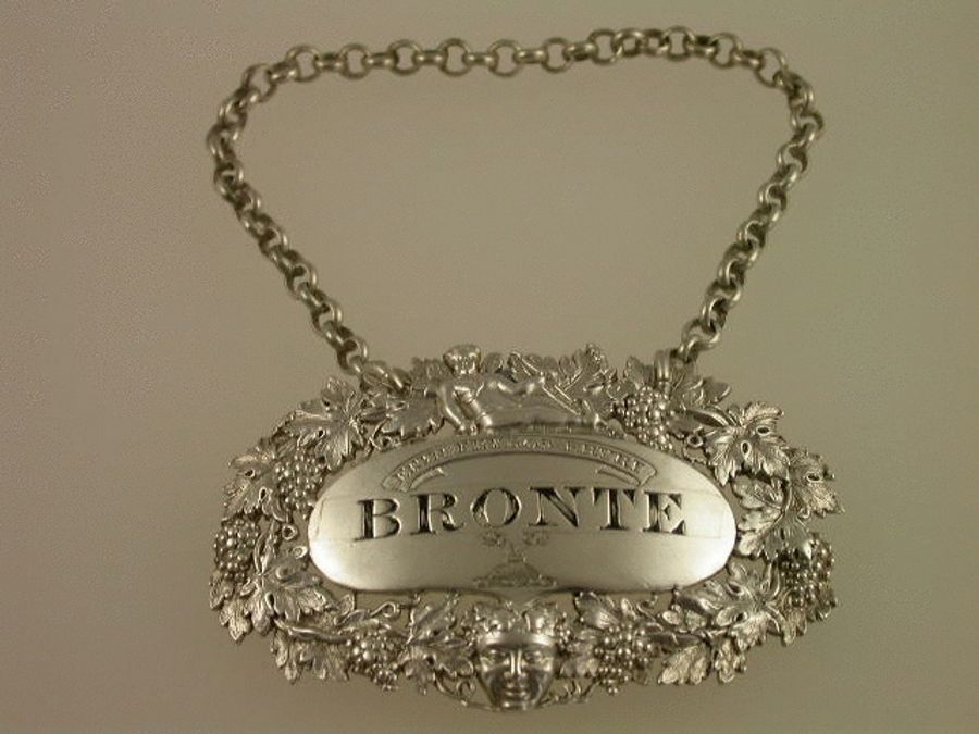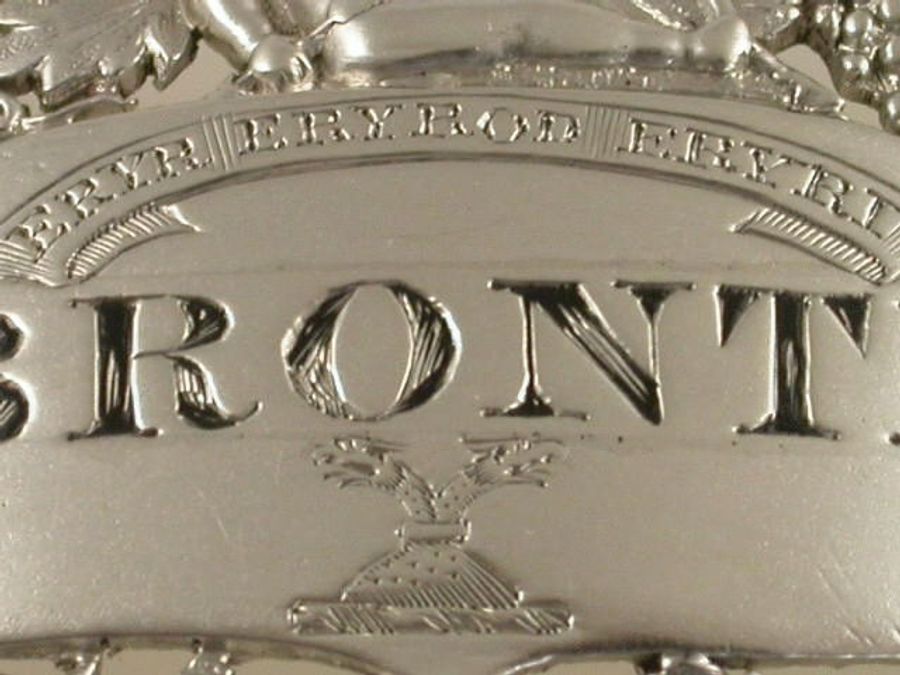 A very fine and rare George III cast silver Wine Label of pierced oval form, the border of vine leaves and grapes, surmounted by a figure of cupid with bow and arrow, a smiling Bacchus mask head below, the oval name plate incised and niello filled for BRONTE, a motto above and a crest below. The motto: “ERYR ERYROD ERYRI” (The Eagle of the Eagles of North Wales). The Crest: An Eagle’s head with two necks couped proper, for the family of OWEN, Worcestershire. See Wine Labels 1730 – 2003 by John Salter, page 77, fig 287.