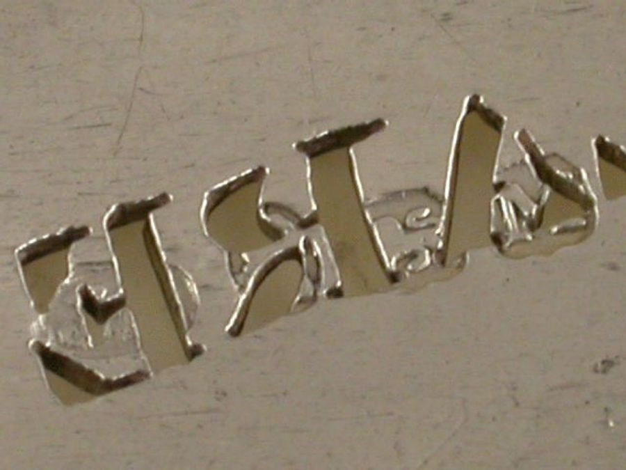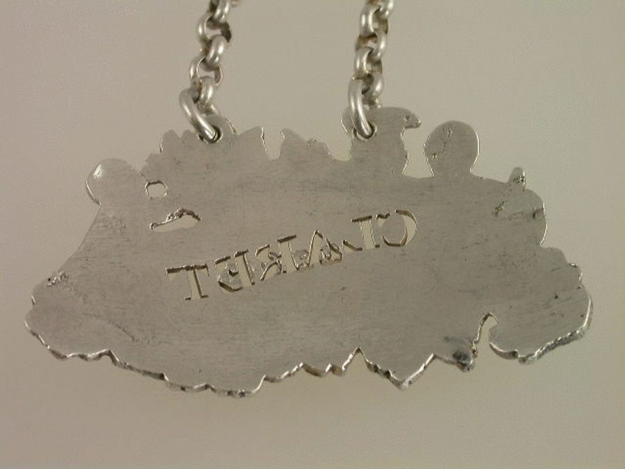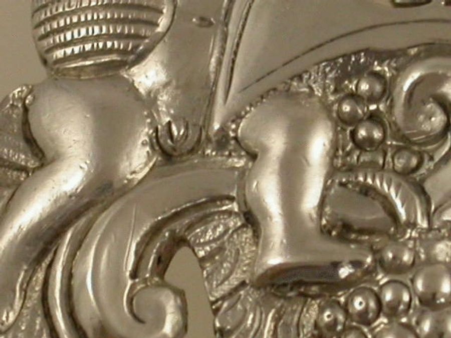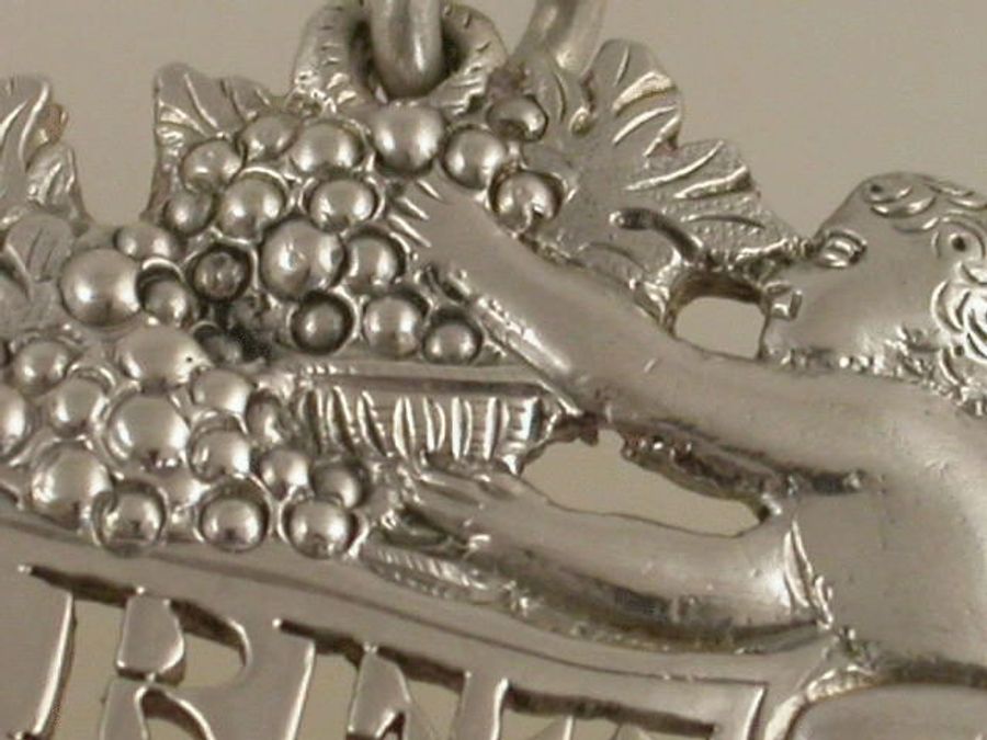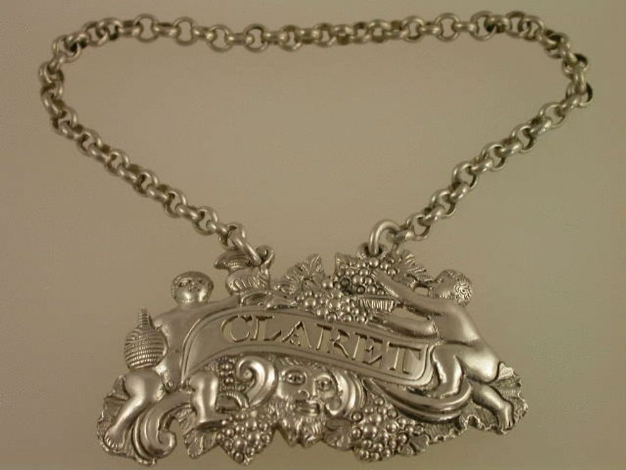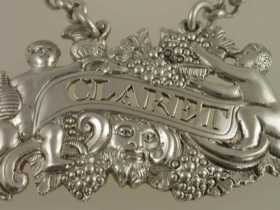 A very good George III heavy cast silver Wine Label of “two Putti with jug and bottle” form, depicting two naked Putti, one holding a goblet and a flask, the other a basket of grapes supporting a scroll shaped name panel pierced for CLARET. Bacchus mask below. Quite unusually, the left hand Putto is cast complete, without a fig leaf to conceal the fact that he is quite obviously a male, as is more often the case.