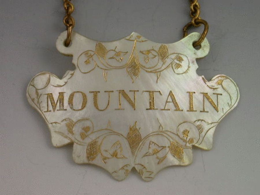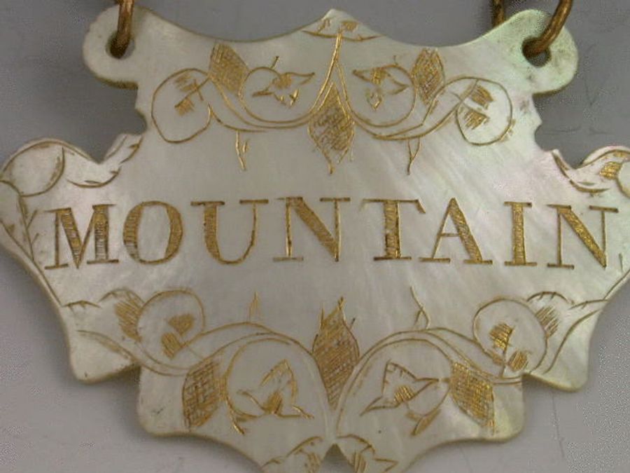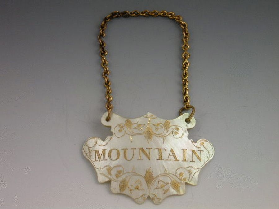 A very fine mid 18th century Mother of Pearl Wine Label of escutcheon form, engraved with gilded decoration and titled MOUNTAIN. Complete with original gilt chain and jumper rings. c1750-60. An example of the earliest form of MOP labels.