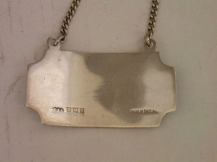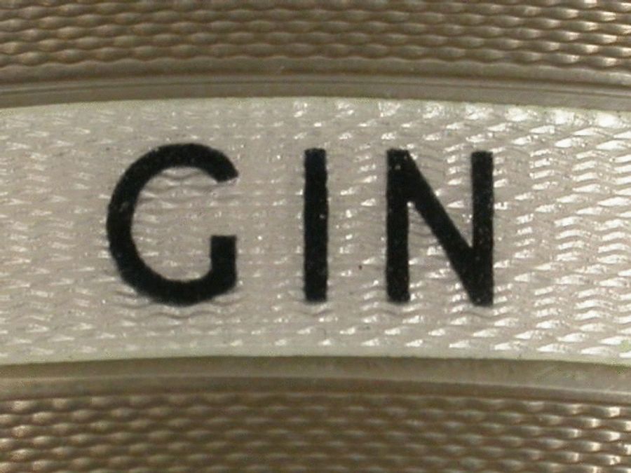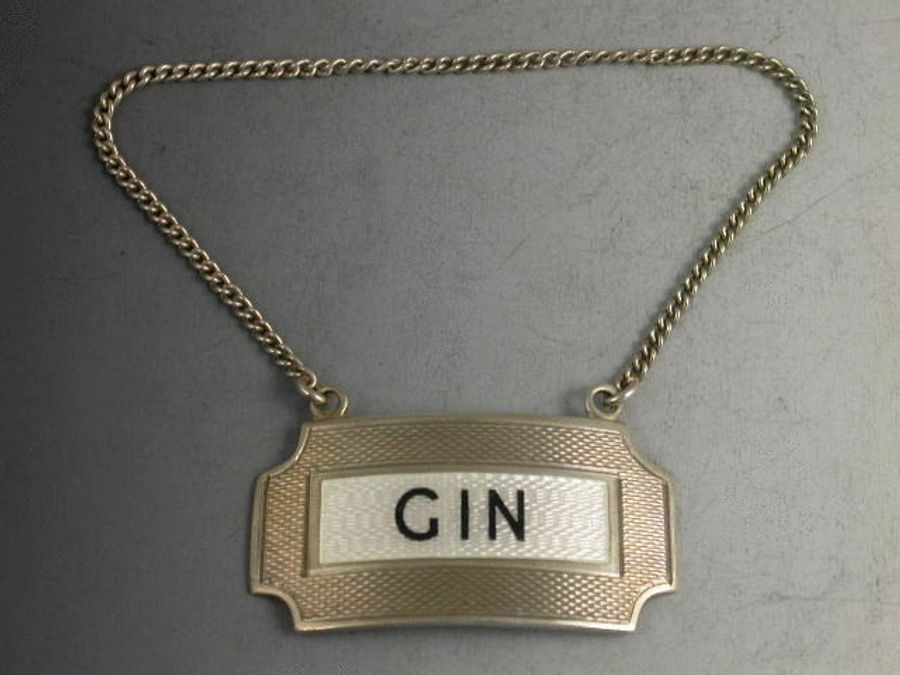 A mid 20th century silver and enamel Wine Label in the Art Deco style, of rectangular form with raised eyelets and concave cut corners, engine turned background, enamelled in black for GIN on a white guilloche enamel panel.