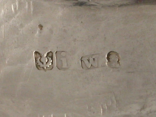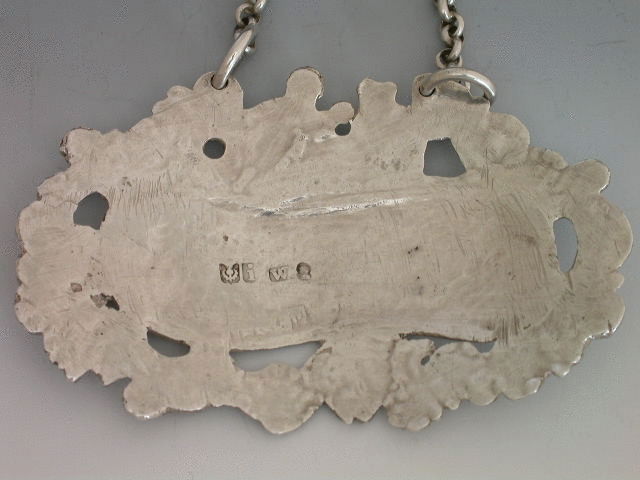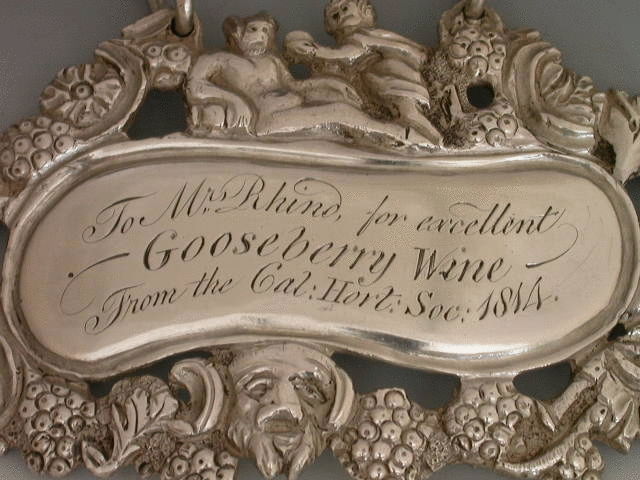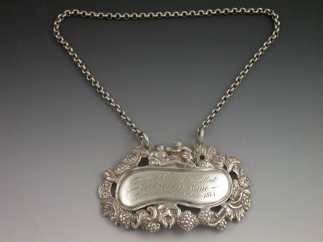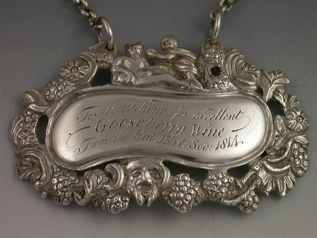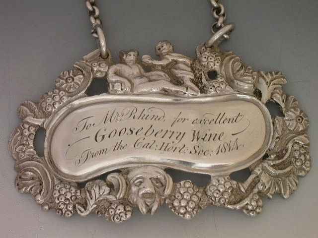 An extremely fine and rare early 19th century Scottish heavy cast silver Wine Label, of ""Reclining Dionysus"" form, the shaped oval label with elaborate border of grapes, foliage, flower heads and a bacchanalian mask head, a recling figure of Dionysus being attended by a putto above. The scrolled oval nameplate engraved; To Mrs Rhind for excellent GOOSEBERRY WINE From the Cal:Hort:Soc:1814.