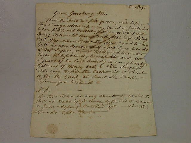 The Caledonian Horticultural Society are recorded as awarding a number of these Wine Labels as prizes during the first half of the 19th century, but most interestingly, this label is accompanied by the original recipe sent to Mrs Rhind by Mrs Lloyd and dated January 29th 1808. The recipe reads as follows:- ""Green Gooseberry Wine. When the fruit are full grown, and before they change colour - to every pound of Gooseberries when pick'd and bruised - put one quart of cold spring water - let them stand three days stirring them often - then strain the liquor and to every gallon now measured off - put three pounds of loaf sugar, stir it well and when the sugar is difsolved Barrel and put a quart of the best Brandy to every twenty gallons of wine, and a little isinglafs. Take care to fill the cask - let it stand in the cask at least six months before you bottle it. N:B: As this wine is very sweet it wou'd be just as well if it were suffered to remain a year before Bottled off - but this depends on the taste""