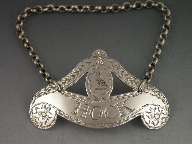 An unusual George III 18th century silver Wine Label of scroll form with both ends turned under, a central oval cartouche engraved with a crest and supported by swags, bright-cut engraved decoration, incised for HOCK. The crest of a standing bird, possibly a Thrush, for numerous families.
