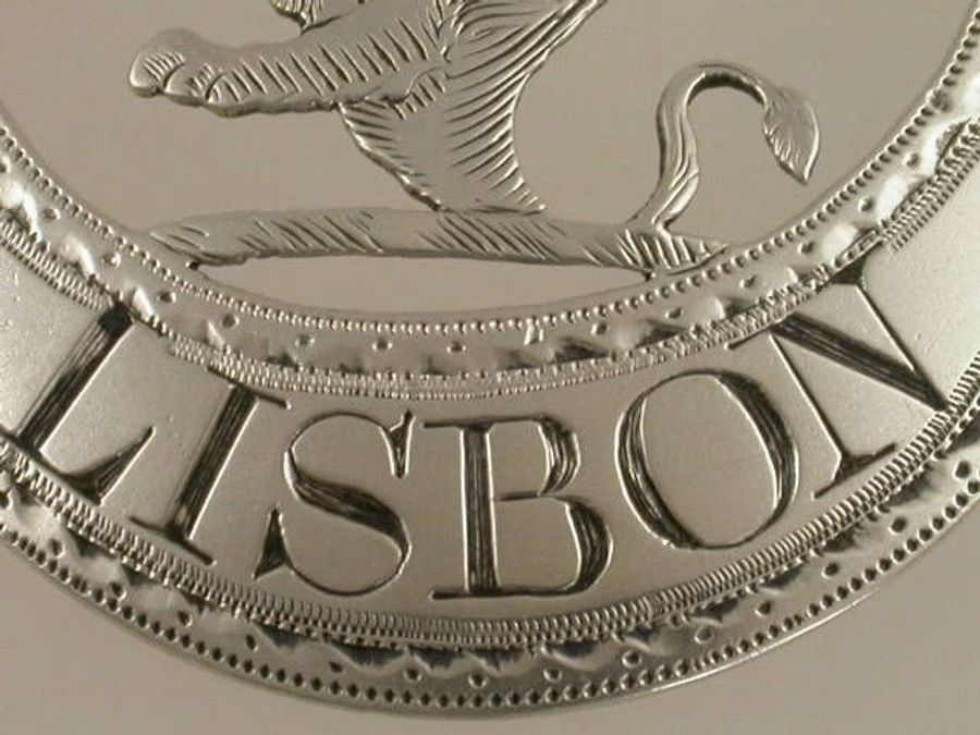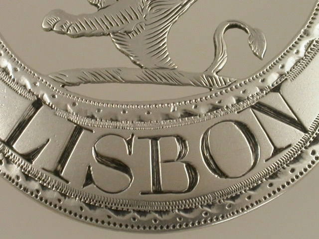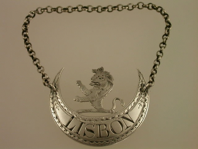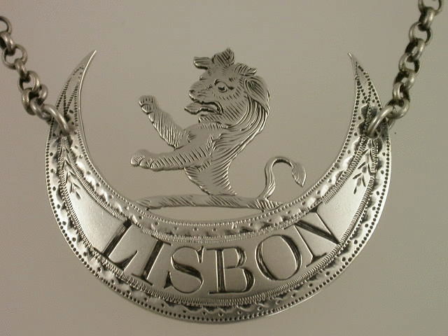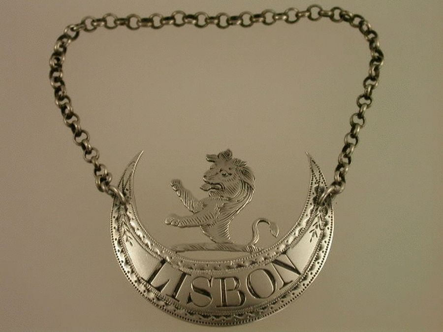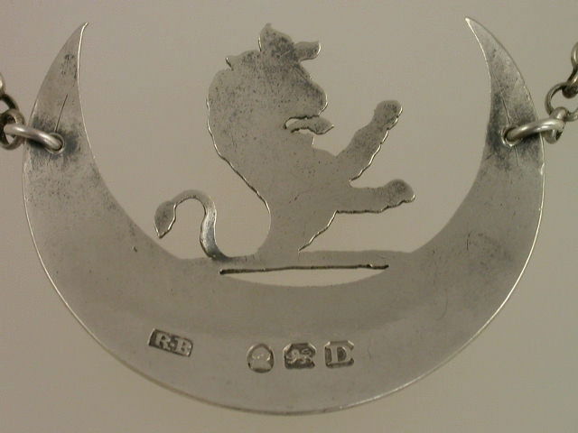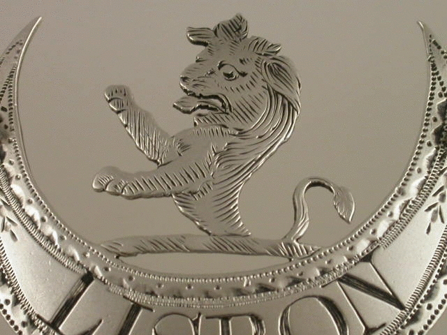 An extremely rare 18th century George III Armorial silver Wine Label of crescent form, with pricked and bright-cut engraved decoration. A crest of a demi Lion Rampant between the horns.