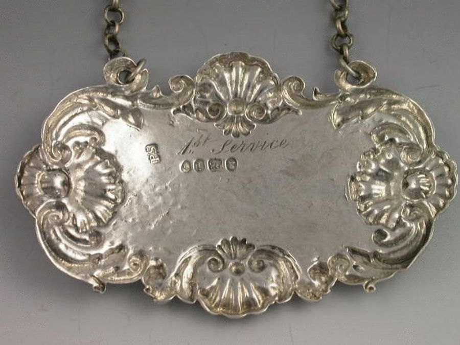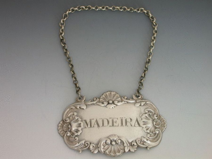 A rare George IV die-stamped silver Wine Label of shaped oval cartouche form, the border with scrolls and shells, incised for MADEIRA. The reverse engraved 1st Service.