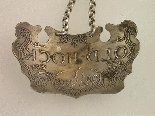 A rare mid 18th century die stamped Old Sheffield plate Wine Label of ""copper back"" escutcheon form decorated with vine leaves, grapes and tendrils and stamped for OLD HOCK.