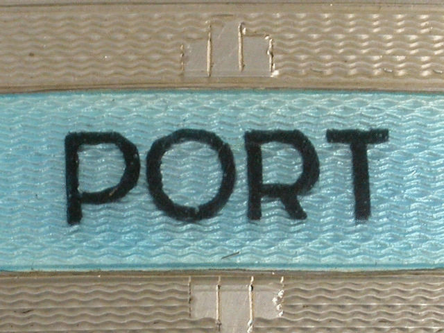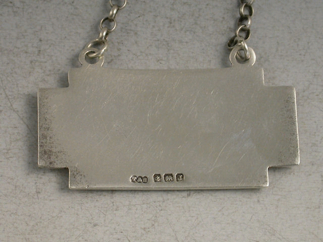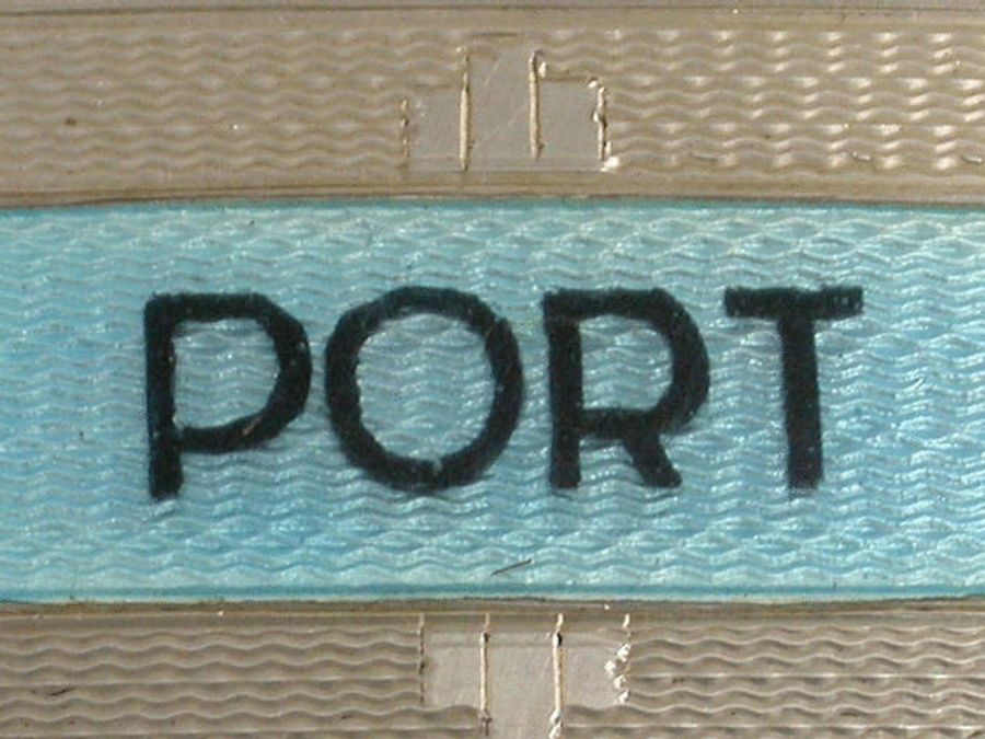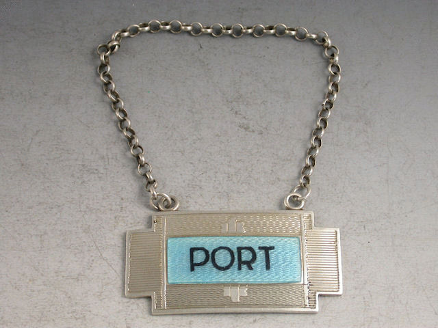 A rare 20th century silver and enamel Wine Label from the Art Deco period, of rectangular form with raised eyelets and right angled cut corners, engine turned background with engraved cubes above and below the nameplate enamelled in black for PORT on a blue guilloche enamel panel.