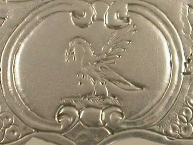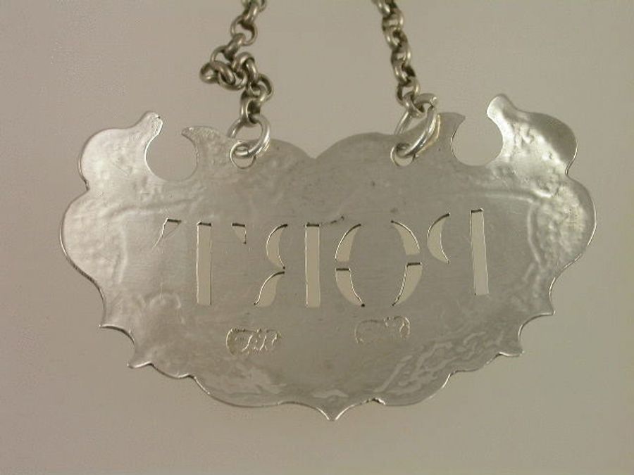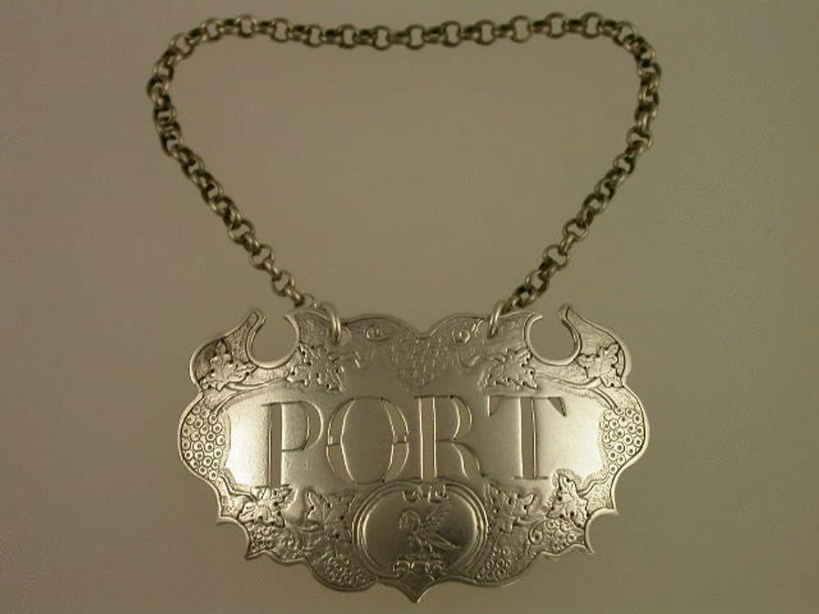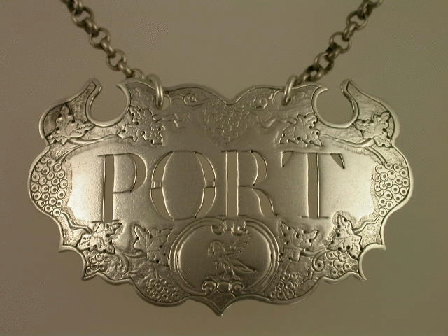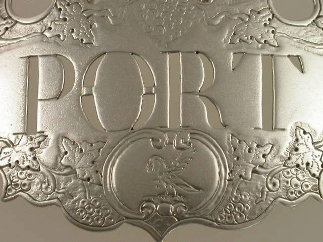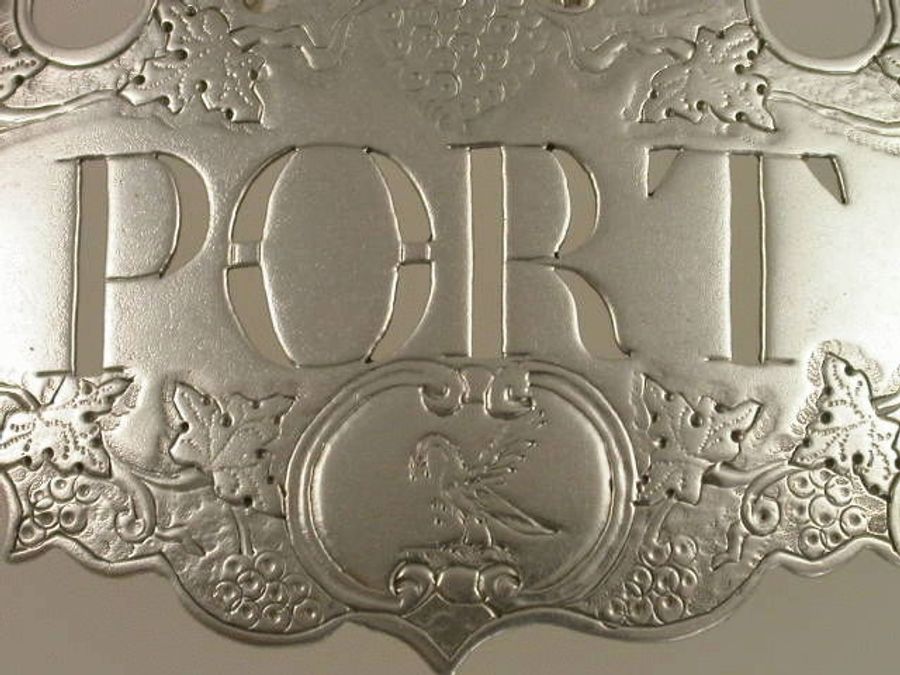 An extremely rare George II silver Wine Label of elongated chased escutcheon form, decorated with vine leaves, grapes and tendrils, with an integral scrolled cartouche engraved with a crest of a Pelican in its Piety, pierced with bold lettering for PORT. The ""Pelican in her Piety"" is an ancient Christian symbol often used in Heraldry, possibly originating in the Middle East. It usually depicts a female Pelican on her nest, with wings half spread and chicks waiting at her feet with open beaks. She is plucking her breast and allowing the drops of blood to fall into the mouths of the chicks, thus symbolising Christ feeding his flock with his blood.