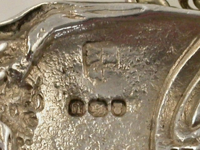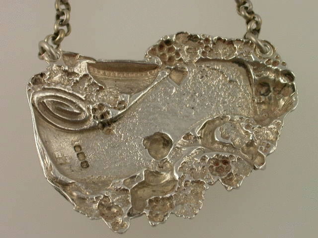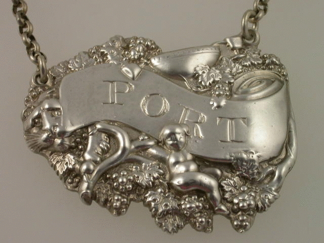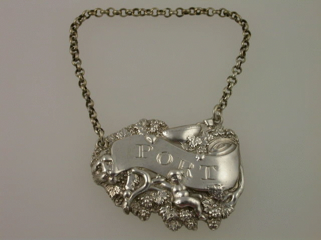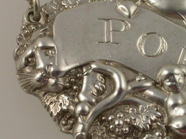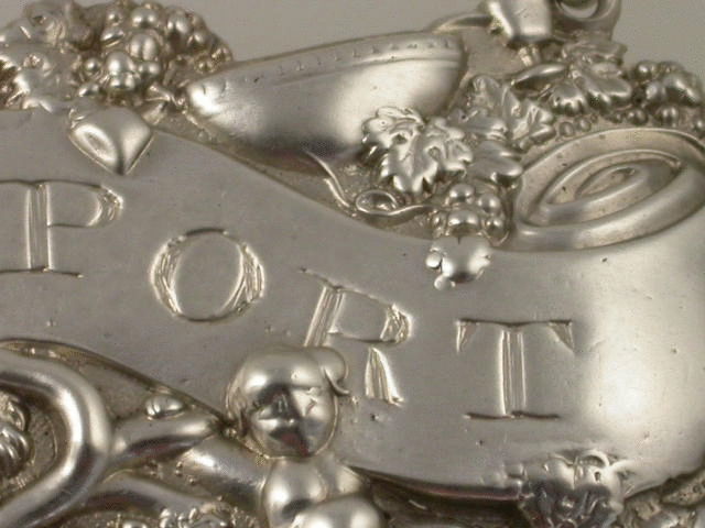 A rare George III heavy die-stamped silver Wine Label with elaborately decorated border depicting a bowl with two goblets, a naked putto amongst vine leaves and grapes, with a lion looking around the end of the scrolled title plate incised for PORT.
