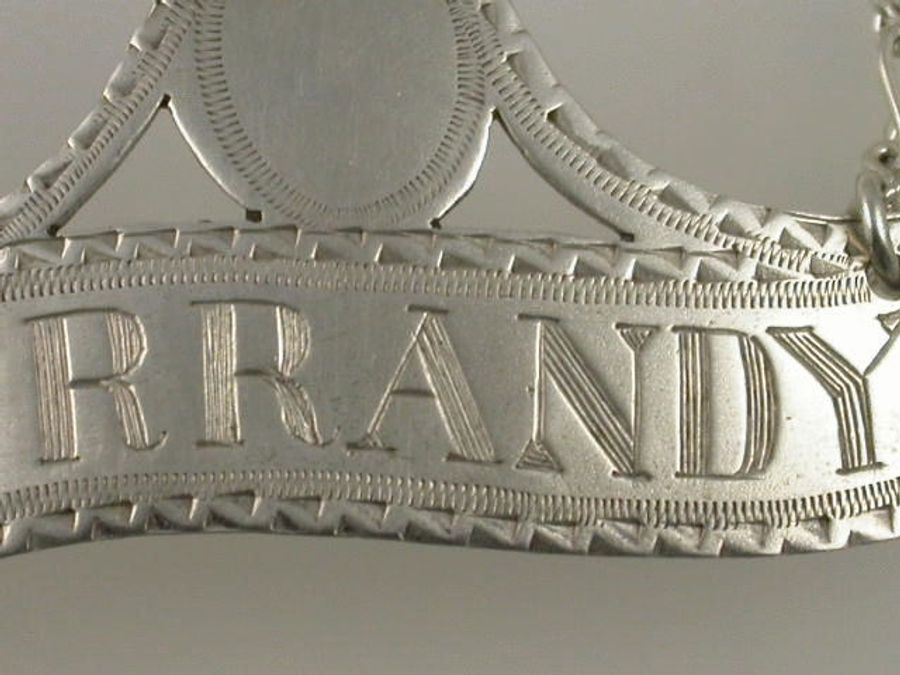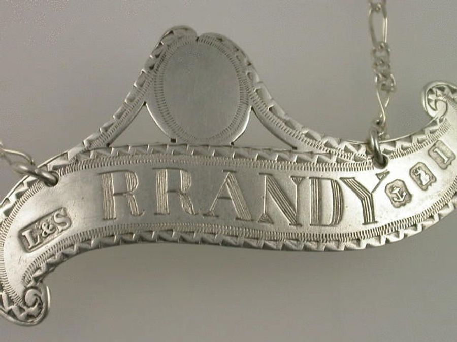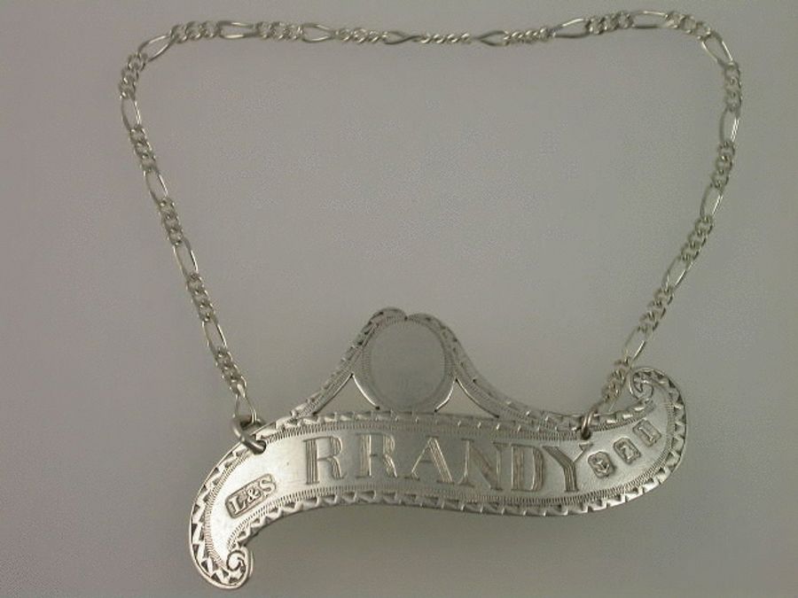 They say ""Brandy Makes You Randy"" ! This early 20th century Britannia standard silver Wine Label seems to confirm that old colloquialism. A charming slip of the hand by the engraver and a simple miss spelling of Brandy. Of asymmetrical scroll form with vacant shield above, bright cut feather edge borders, in the style of Hester Bateman.