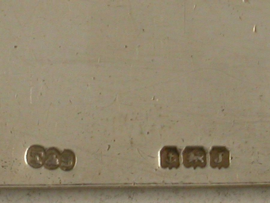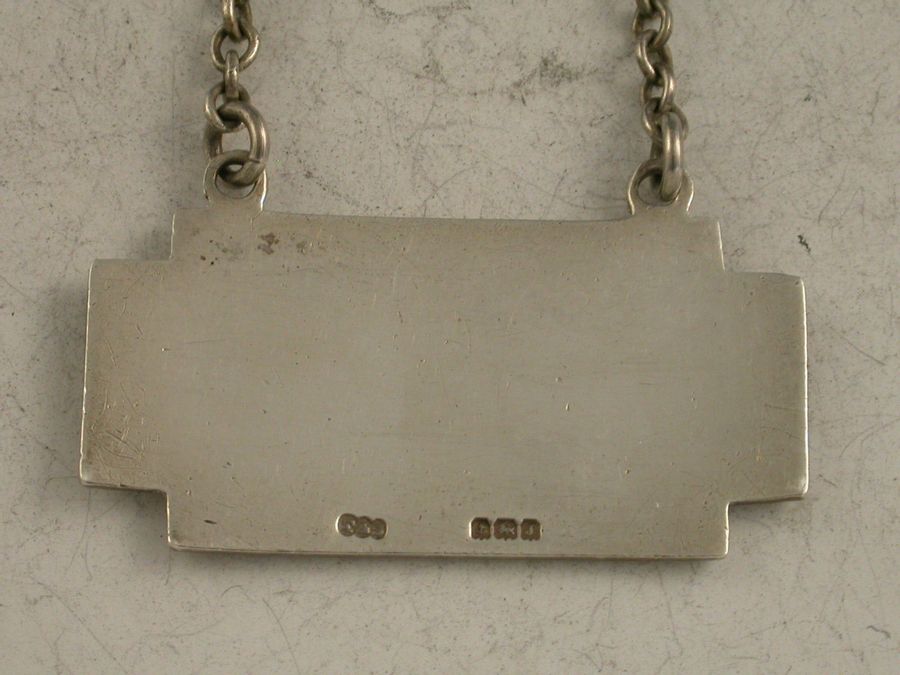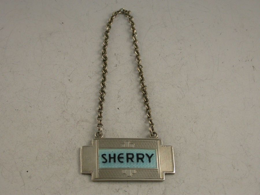 A rare 20th century silver and enamel wine Label from the Art Deco period, of rectangular form with raised eyelets and right angled cut-corners, engine turned background with engraved cubes above and below the nameplate enamelled in black for Sherry on a blue guilloche enamel panel.