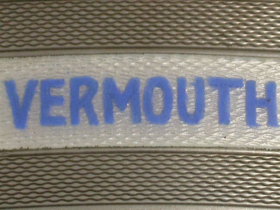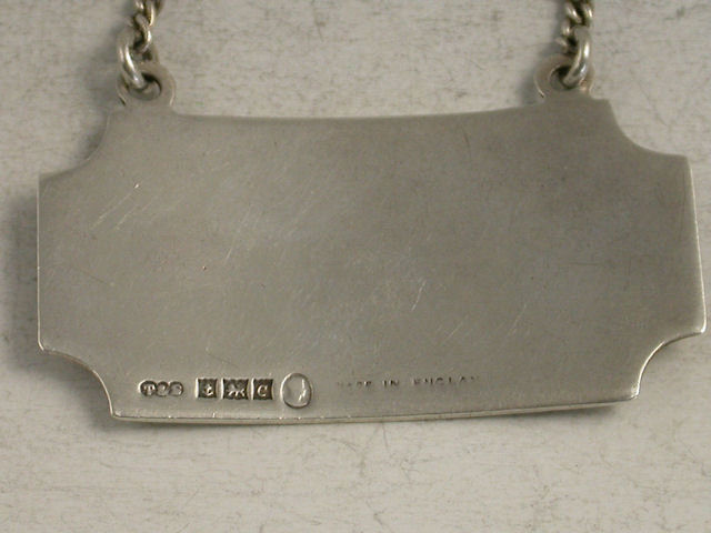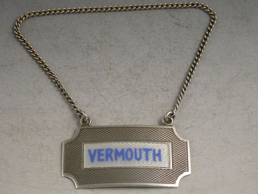 A mid 20th century silver and enamel Wine Label in the Art Deco style, of rectangular form with raised eyelets and concave cut corners, engine turned background, enamelled in blue for VERMOUTH on a white guilloche enamel panel. A rare name.