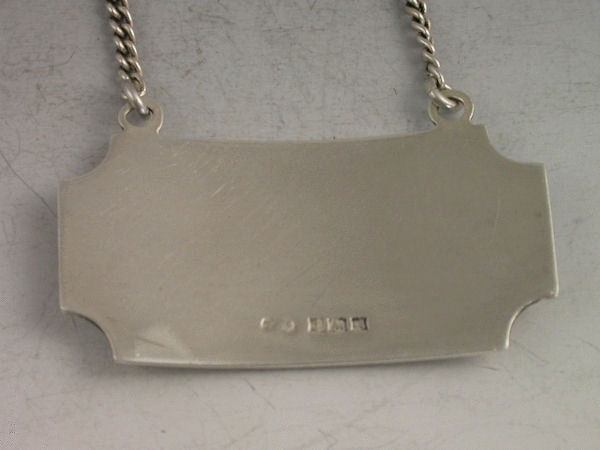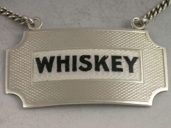A mid 20th century silver and enamel Wine Label in the Art Deco style, of rectangular form with raised eyelets and concave cut corners, engine turned background, enamelled in black for WHISKEY on a white guilloche enamel panel.