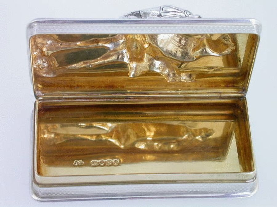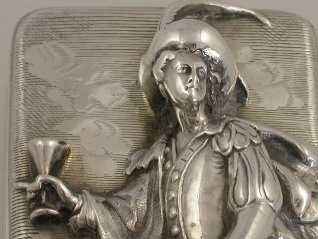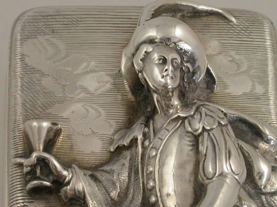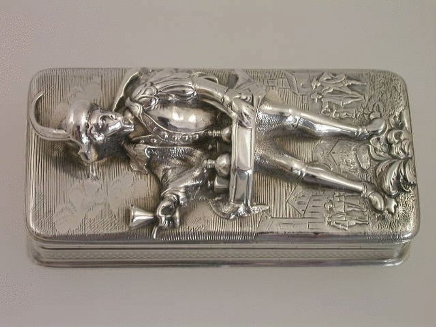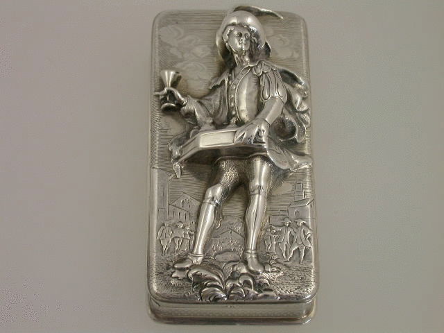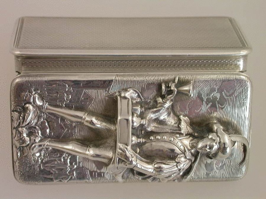 A very fine William IV silver ""Wine Pedlar"" Snuff Box, the lid chased in high relief depicting a Cavalier gentleman trading his wares, the background engraved with figures standing by buildings, the base and sides engine turned. Original bright silver gilt interior.